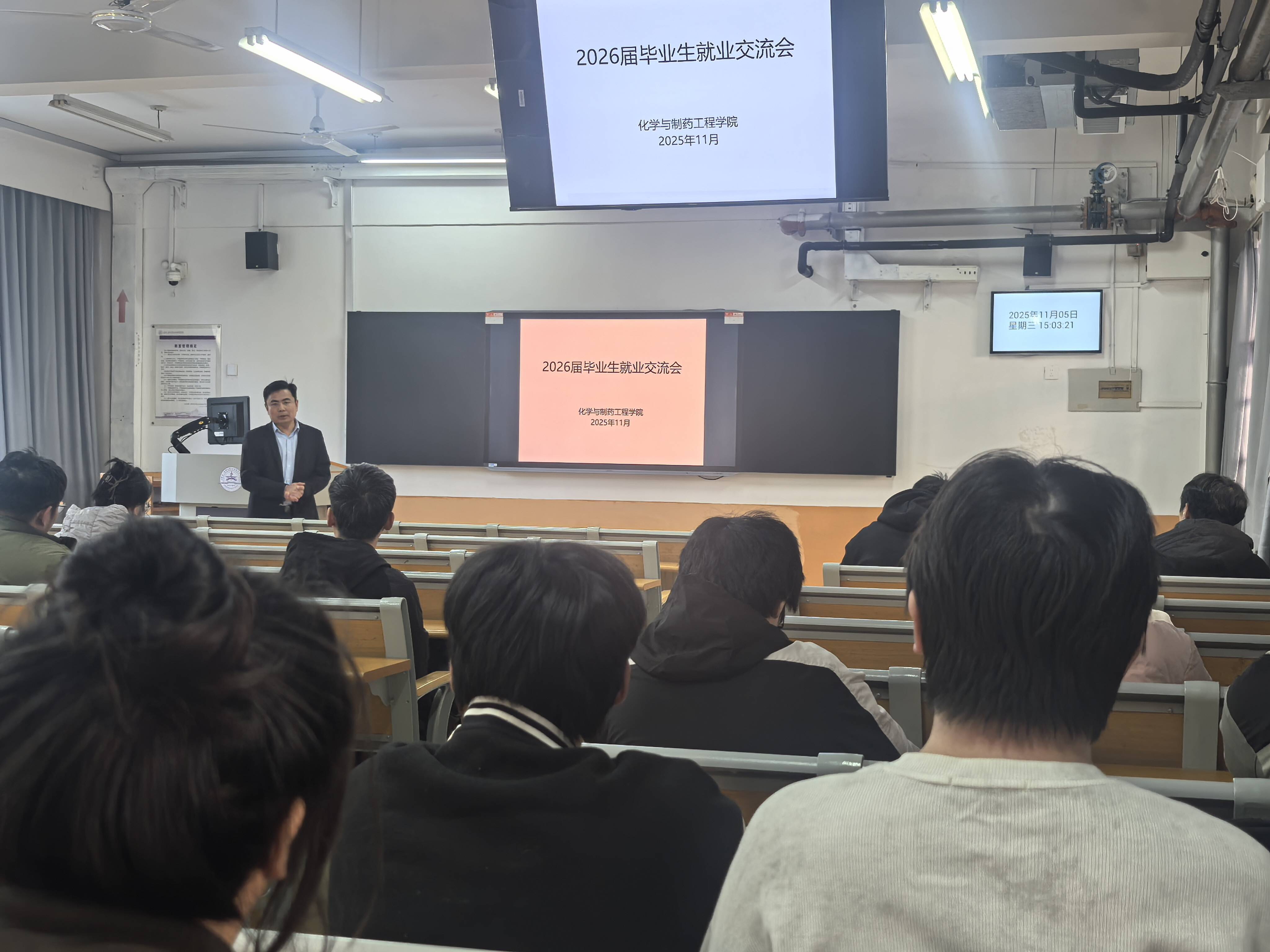 11月5日下午,学院于教学北楼A1004召开2026届毕业生就业交流会。学院党委副书记曹明亮、毕业班辅导员吴守林以及“首批就业”群体毕业生参加会议。